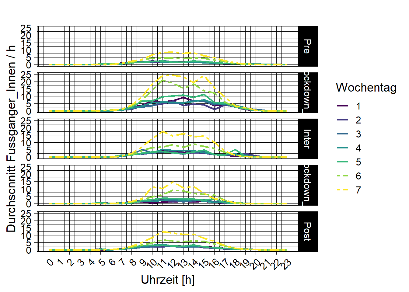 Nun möchten wir genauer untersuchen, wie sich die Besuchszahlen je nach Phase (Pre, Lockdown 1, Inter, Lockdown 2 und Post) auf die Wochentage und Tageszeiten verteilen.