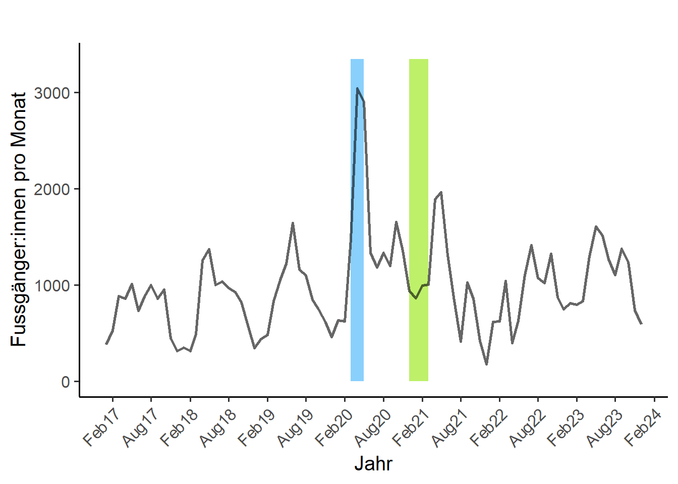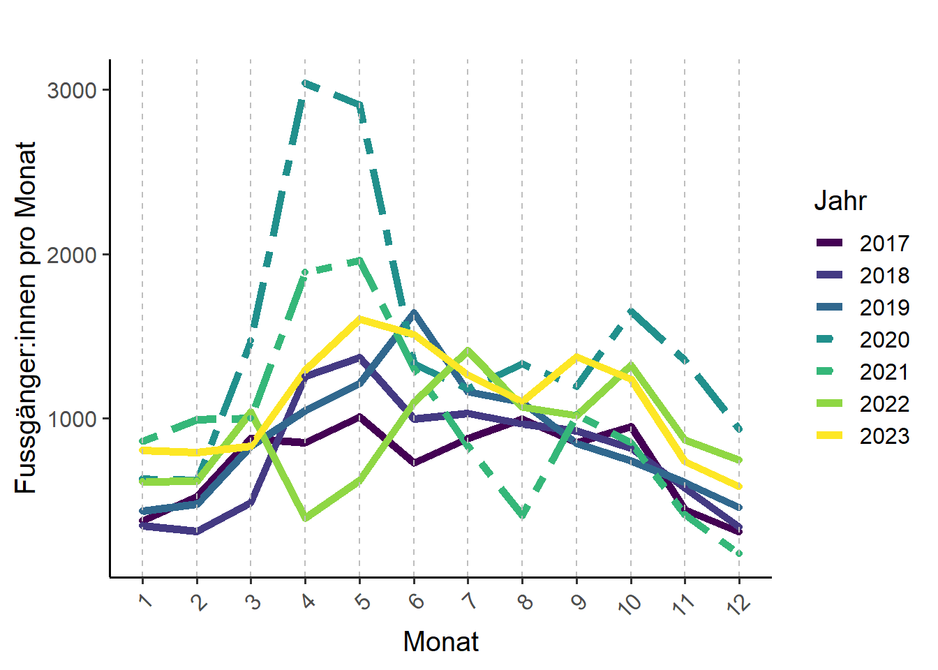 labs(title = "", y = "Fussgänger:innen pro Monat", x = "Jahr") +
