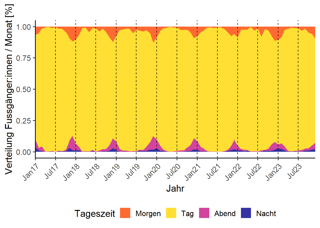 Unser Fokus liegt auf der dunklen Tageszeit. Wie verteilen sich die Besuchenden also auf Morgen, Tag, Abend und Nacht?