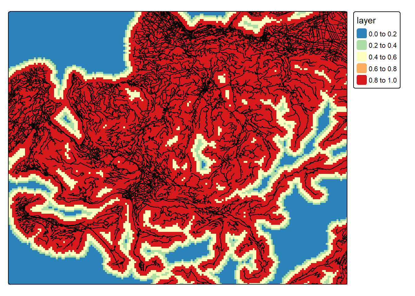 overlay_prelim_2 <- (strassen_classify * 5 + schutzgebiete_classify * 1) / (5 + 1)