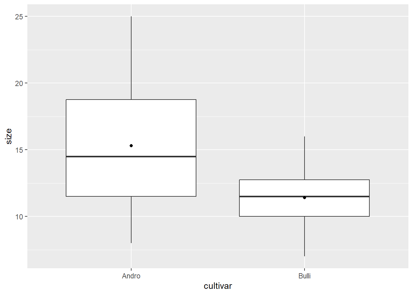 ggplot(blume, aes(x = cultivar, y = size)) +