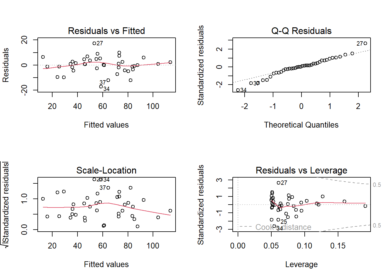-> Das ANCOVA-Modell widerspiegelt die Zusammenhänge wie sie aufgrund der grafisch dargestellten Daten zu vermuten sind gut. Die Residual-Plots zeigen 3 Ausreisser (Beobachtungen 27, 34 und 37), welche “aus der Reihe tanzen”.