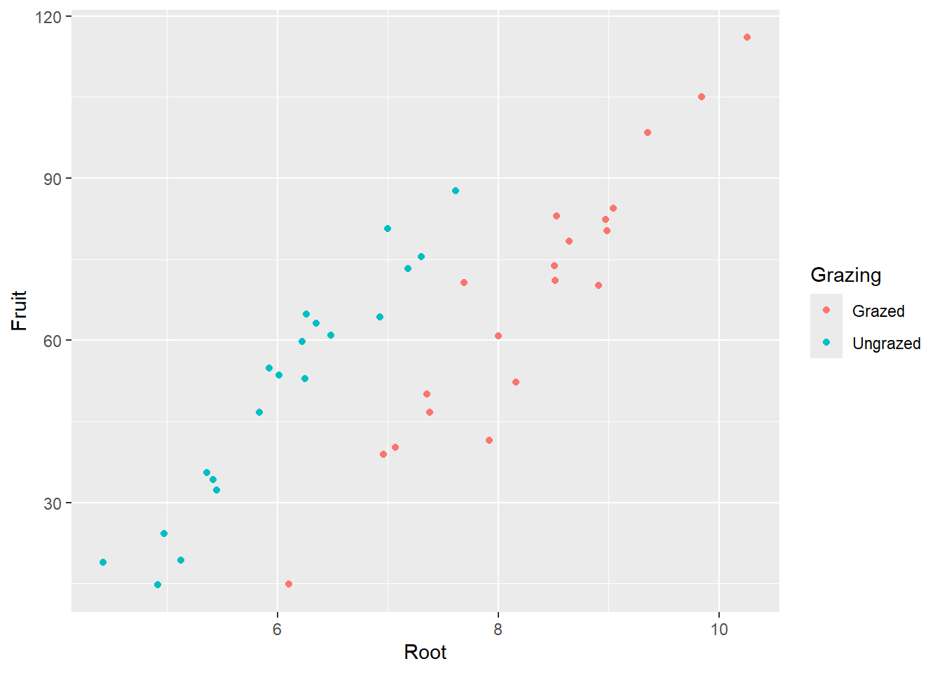 ggplot(compensation, aes(x = Root, y = Fruit, color = Grazing)) +