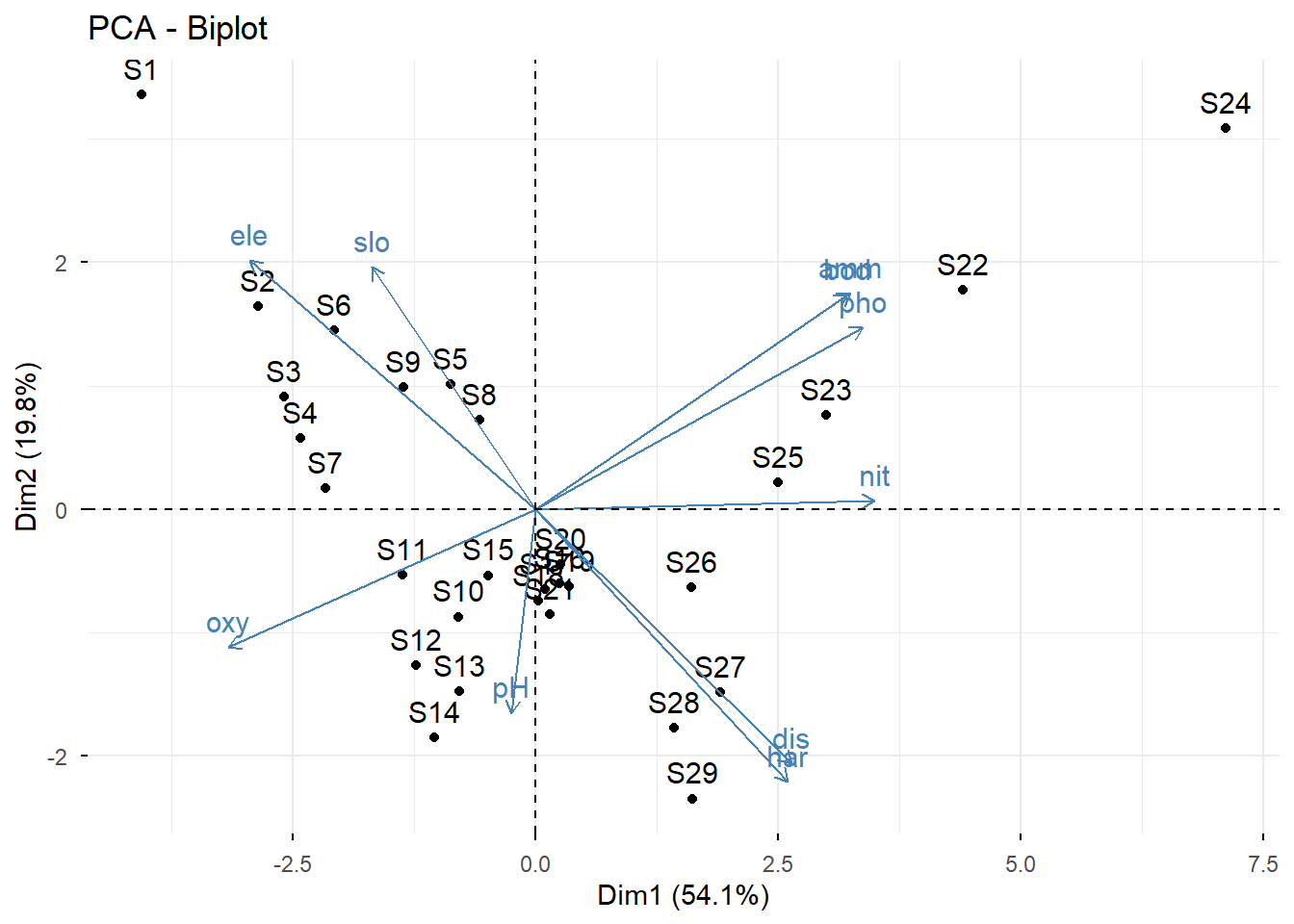 pca_1 <- prcomp(env, scale = TRUE)Wir verwenden hier «scale = TRUE» weil wir Umweltvariablen mit unterschiedliche Masseinheiten verwenden die variierende Skalen aufweisen. Eine unskalierte PCA (default: scale = FALSE ) ist sinnvoll, wenn alle Variablen ähnliche Skalen haben oder die Skalenunterschiede von Interesse sind.