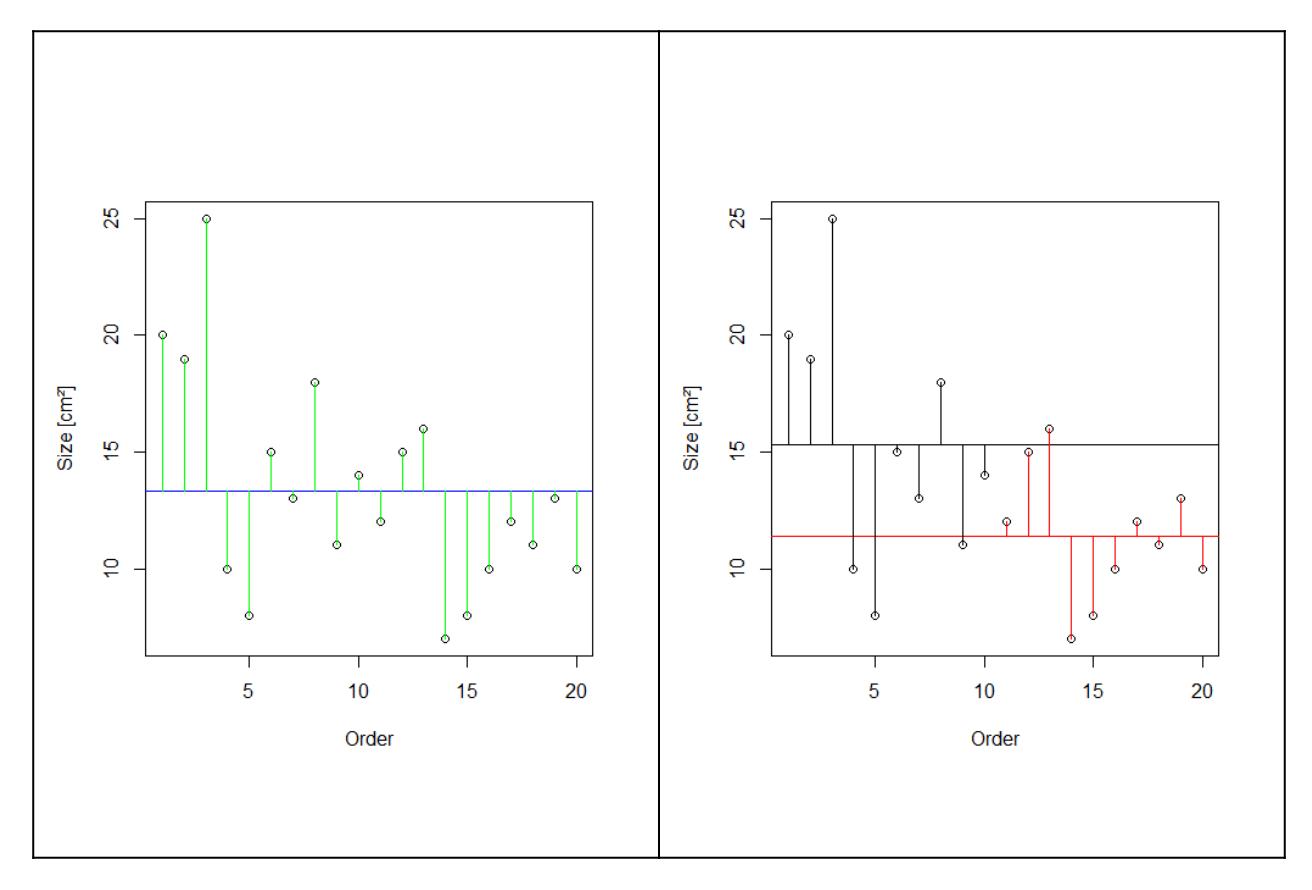 Gehen wir zurück zu unserem Blumenbeispiel. Die Idee der ANOVA ist, dass die Mittelwerte der Blütengrössen der beiden Sorten dann verschieden sind, wenn die Summe der Abweichungen (Residuen) vom Gesamtmittelwert “signifikant” grösser ist als die Summe der Abweichungen von den Sortenmittelwerten. Das ist in der folgenden Abbildung veranschaulicht. Die Punkte stellen die 20 Messwerte der Blütengrössen dar, wobei sie in der rechten Teilabbildung nach Sorten gruppiert sind. Der Gesamtmittelwert links und die beiden Sortenmittelwerte rechts sind als horizontale Linien dargestellt. Die vertikalen Linien sind die Residuen, also die Abweichung der beobachteten von den durch das Modell vorhergesagten Werten. Zusammen ergeben sie den Anteil der Varianz, welcher durch das jeweilige statistische Modell nicht erklärt wird. Das Modell links nimmt an, dass die Blüten einheitlich gross sind, unabhängig von der Sorte, während das komplexere Modell rechts unterschiedliche Mittelwerte abhängig von der Sorte annimmt.
