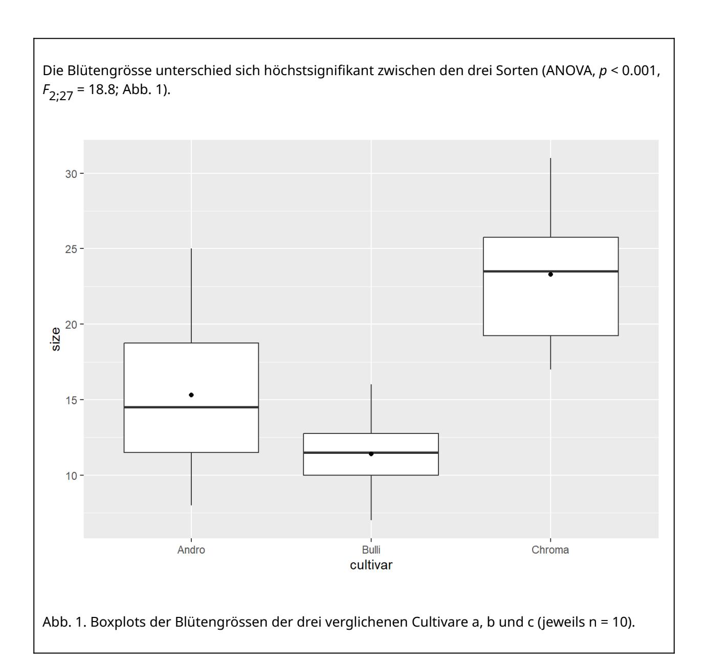 Residuals 27 528.6 19.6In diesem Fall gibt es also höchstsignifikante Unterschiede in der Blütengrösse zwischen den drei Sorten. Wir könnten das Ergebnis kurz und prägnant wie folgt wiedergeben:
