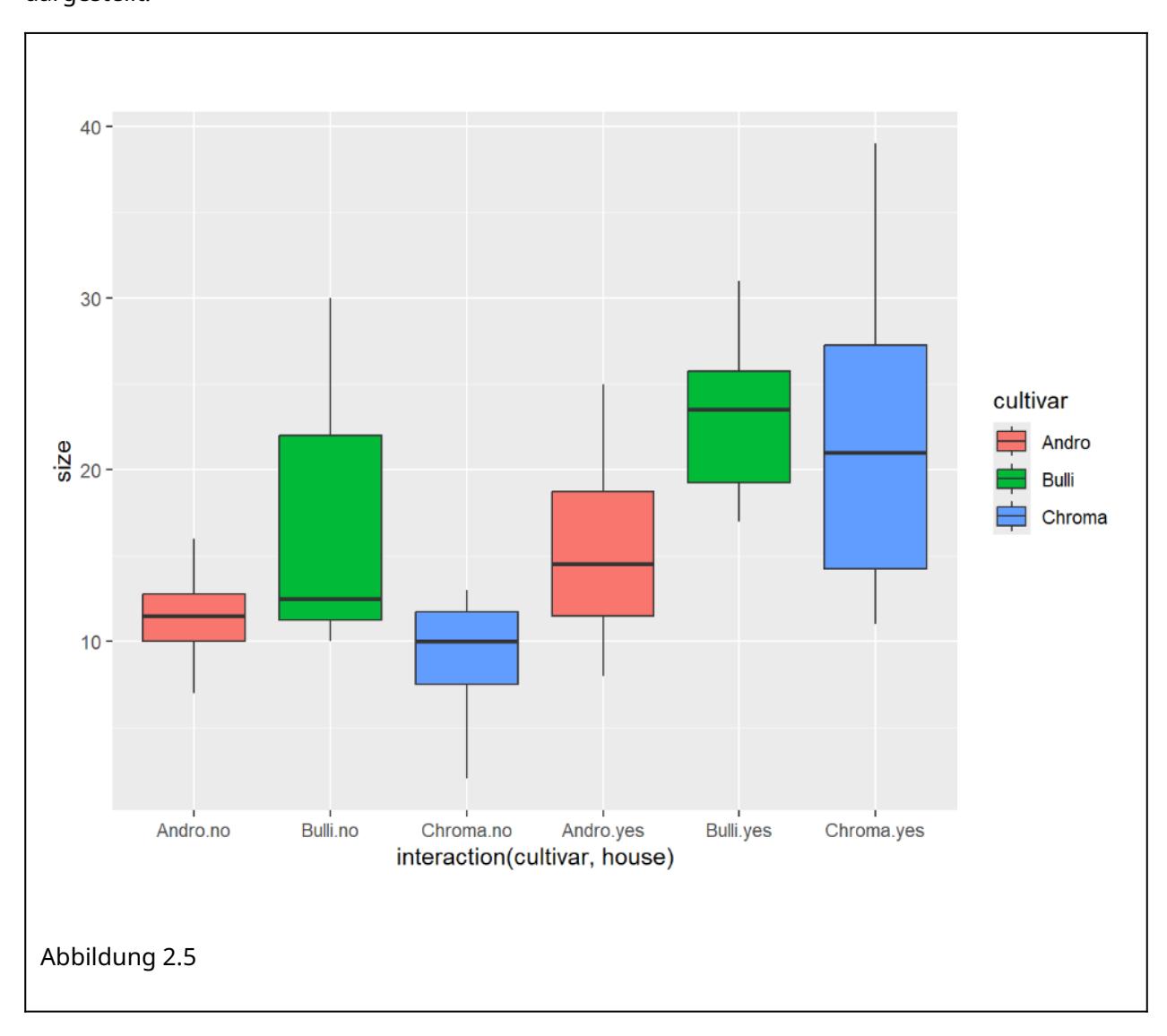 Betrachten wir exemplarisch die Situation mit zwei Prädiktoren (zweifaktorielle Varianzanalyse, twoway ANOVA). Hierzu haben wir in unserem Blumenbeispiel neben den drei Sorten noch ein weiteres “Treatment” hinzugefügt, nämlich, ob die Pflanzen im Gewächshaus (house = yes) oder im Freiland (house = no) aufgezogen wurden. Der Boxplot in der explorativen Datenanalyse ist in Abbildung 2.5 dargestellt.
