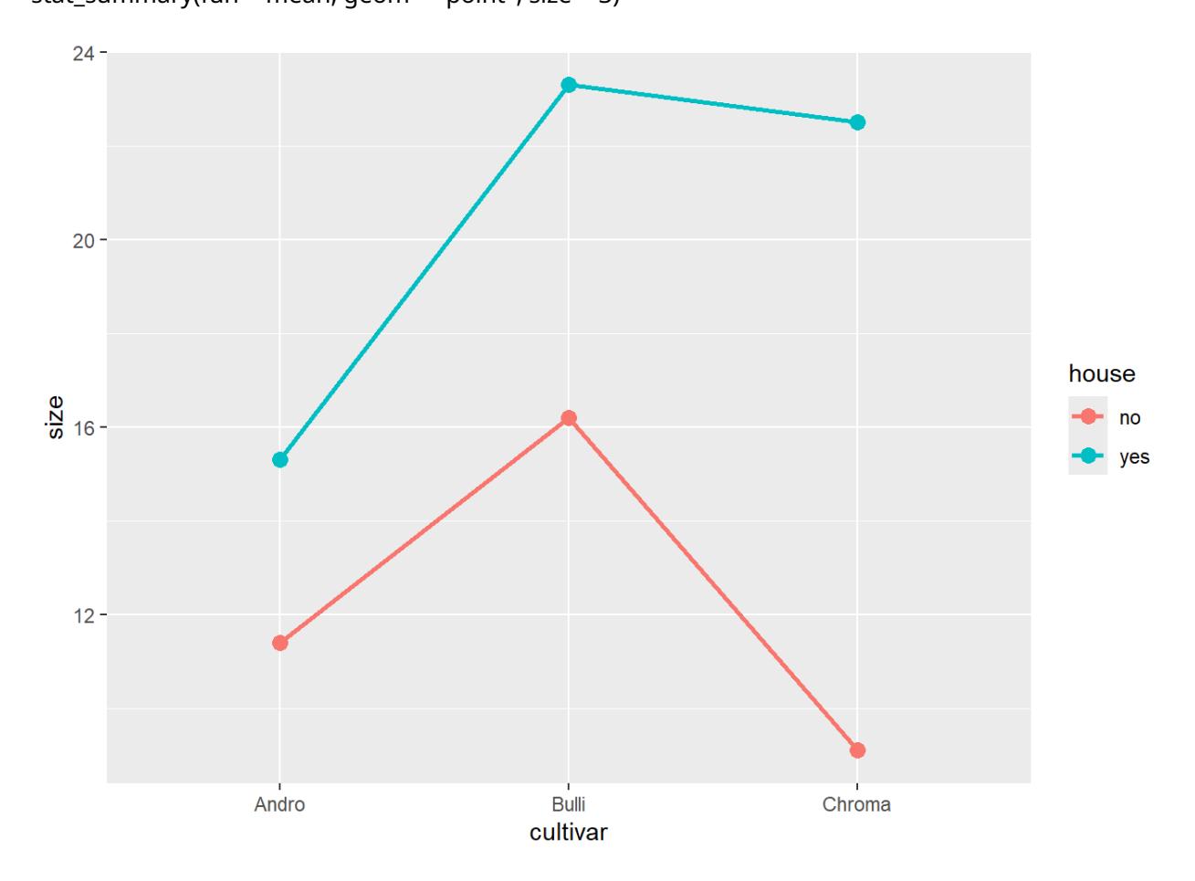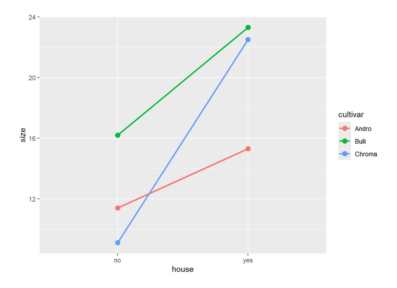 ggplot(blume3, aes(house, size, color = cultivar, group = cultivar)) +
