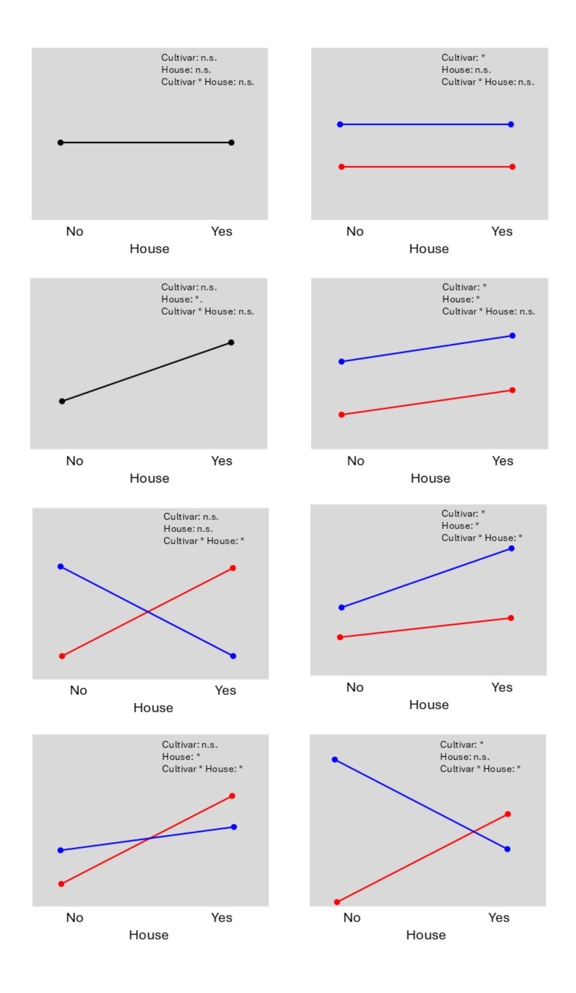 Die folgende Abbildung zeigt, wie ein Interaktionsplots schematisch aussehen würden, je nachdem, welche der Prädiktoren (Cultivar, House, Interaktion) signifikant ist. Insgesamt gibt es 23 = 8 Kombinationen. Zur Vereinfachung zeigt die Abbildung eine Situation mit nur zwei Kultivaren (rot, blau). Schwarze Linien stehen für Linien der Kultivare, die fast deckungsgleich sind.