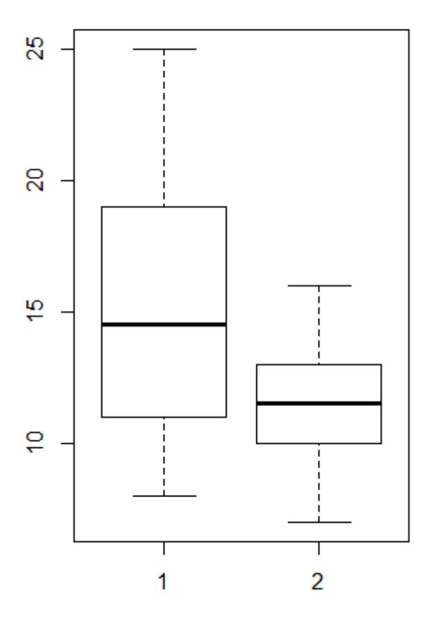 Für die Beurteilung der Varianzhomogenität betrachtet man am besten die Höhe der Boxen im Boxplot. Wenn sie ähnlich hoch sind, ist alles OK, wenn sie sehr stark abweichen, hat man evtl. ein Problem. Sehr stark meint aber, siehe Abbildung 2.2, wirklich sehr stark, d. h. wenn die Box in einer Kategorie mehr als 4-mal so hoch ist wie in einer anderen (bei gleichen/ähnlichen Replikatzahen), und ab mehr als doppelt so hoch bei erheblich verschiedenen Replikatzahlen. Im vorliegenden Fall ist die Varianz in Gruppe 1 etwa 2.5-mal so hoch wie in Gruppe 2, da die Zahl der Replikate aber identisch war, wäre das noch OK.