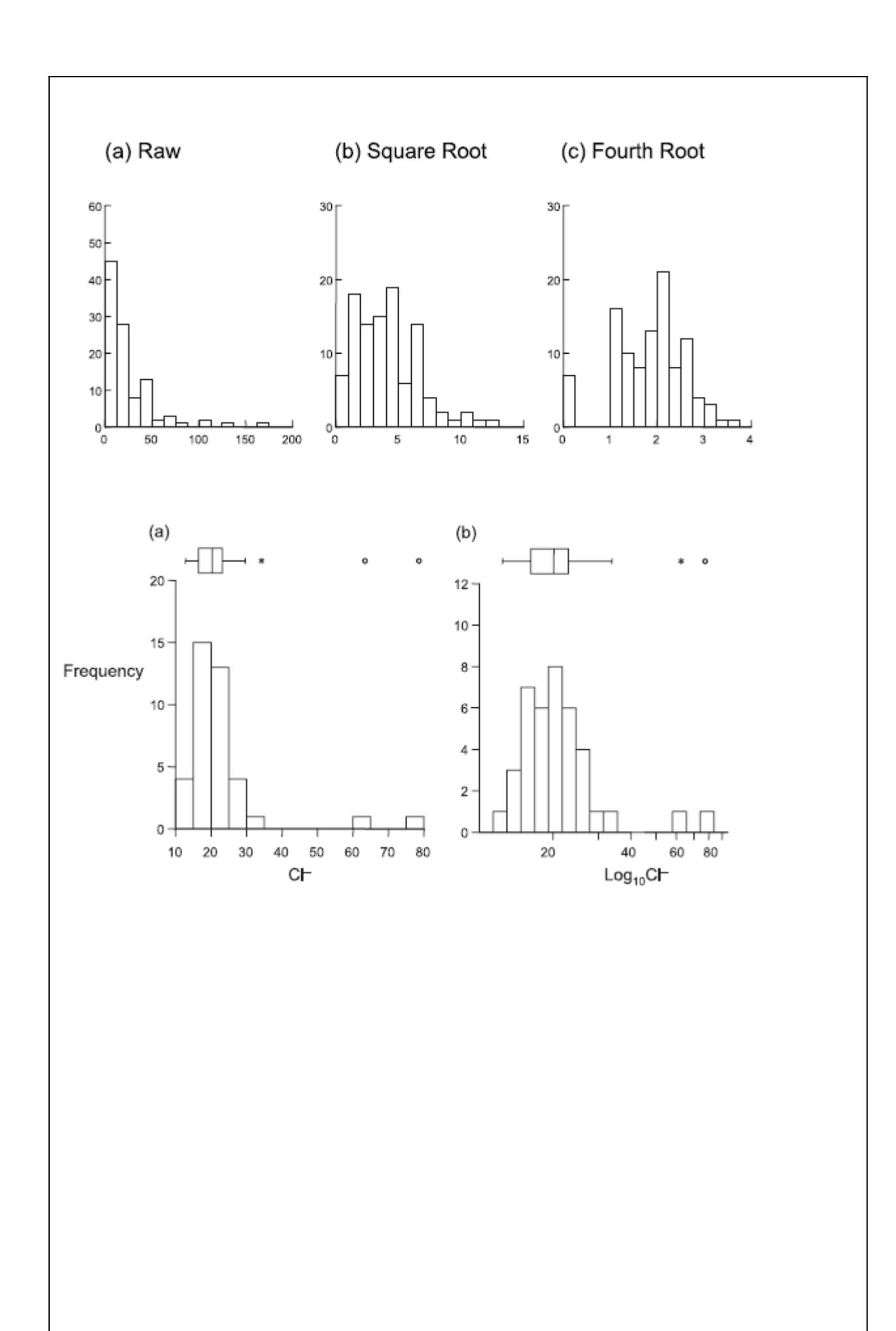 Abbildung 2.4. Auswirkungen von Wurzel-, Logarithmus- und Arcsin-Transformationen auf die Verteilung von Daten. Man sieht, dass bei den gezeigten Verteilungen in den Originaldaten die jeweiligen Transformationen eine Verbesserung bezüglich der Normalverteilungsannahme brachten (aus Quinn & Keough 2002).