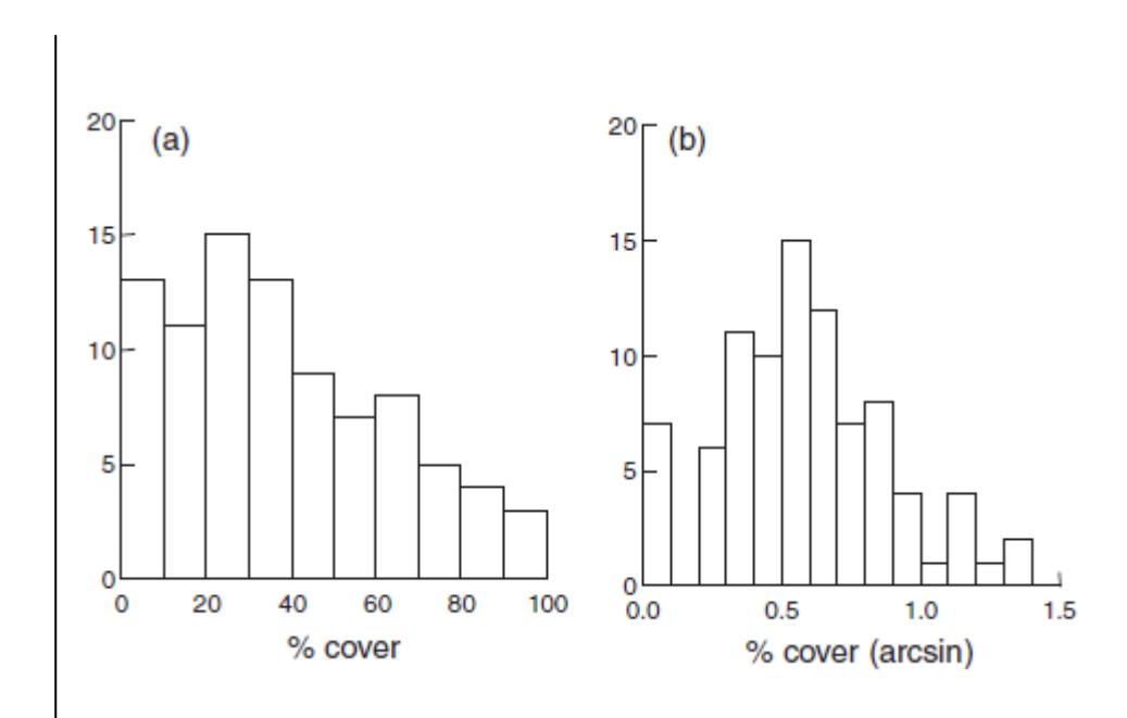 asin(sqrt(x))\*180/pi- Wurde traditionell für Prozentwerte (Proportionen) und andere abhängige Variablen empfohlen, die zwischen 0 und 1 bzw. 0 und 100% begrenzt sind (z. B. Quinn & Keough 2002).