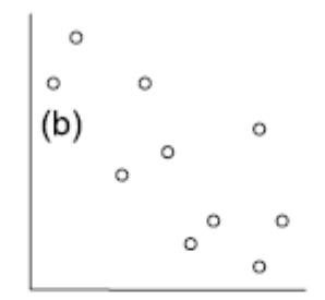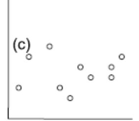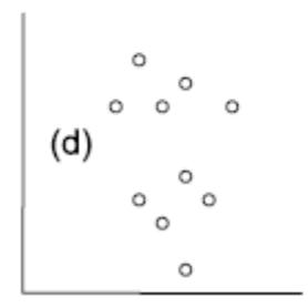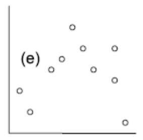 Die folgenden fünf Abbildungen zeigen verschiedene Situationen. Bei (a) liegt eine positive Korrelation vor, bei (b) eine negative und bei (c)–(e) keine Korrelation. Bei (e) erkennt man zwar visuell eine Beziehung (ein “Peak” in der Mittel, also eine unimodale Beziehung), aber das ist eben kein linearer Zusammenhang.
