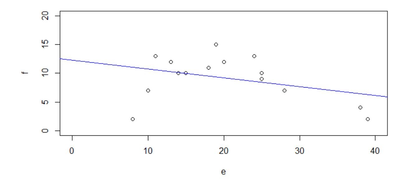 Wichtig ist, dass man wie bei allen statistischen Modellen nachträglich die Modellvoraussetzungen prüft. Betrachten wir das jetzt für die simulierten Daten f und e, ohne Berücksichtigung eines quadratischen Terms, also f~e. Gezeigt sind die Ergebnisdarstellung des Modells (samt Code) und die vier Residualplots.