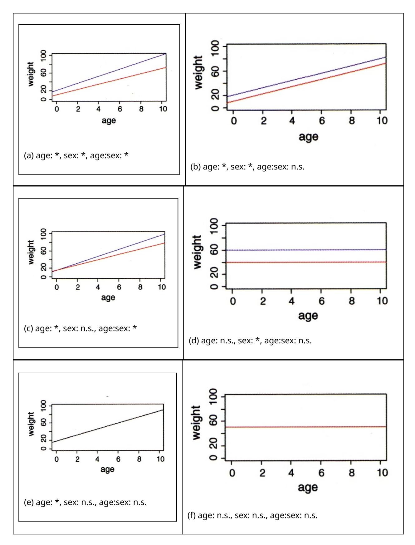 Wie wir schon bei “Lineare Modelle allgemein” in Statitik 2 gesehen haben, lassen sich metrische und kategoriale Variablen in einem einzigen linearen Modell kombinieren. Eine ANCOVA macht genau dieses, ist also im Prinzip eine Kombination aus ANOVA und linearer Regression. Stellen wir uns vor, wir hätten einen Datensatz von Körpergewichten von Kindern unterschiedlichen Alters (age: metrisch) und Geschlechts (sex: kategorial/binär, dargestellt als blau und rot). Eine ANCOVA testet nun, ob und wie sich das Gewicht in Abhängigkeit von beiden Faktoren verhält. Dabei gibt es im Prinzip sechs verschiedene Möglichkeiten/Ergebnisse, siehe Abbildung 3.1.