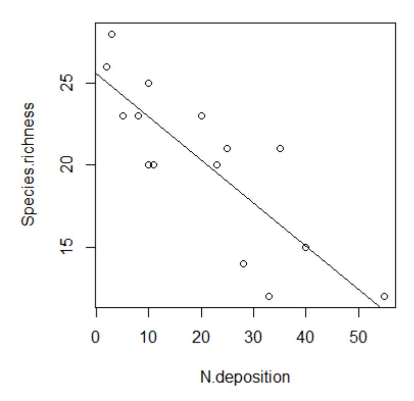 lm_1 <- lm(Species_richness~N.deposition, data = df)summary.aov(lm_1) # ANOVA-TabelleResponse: Species_richness
