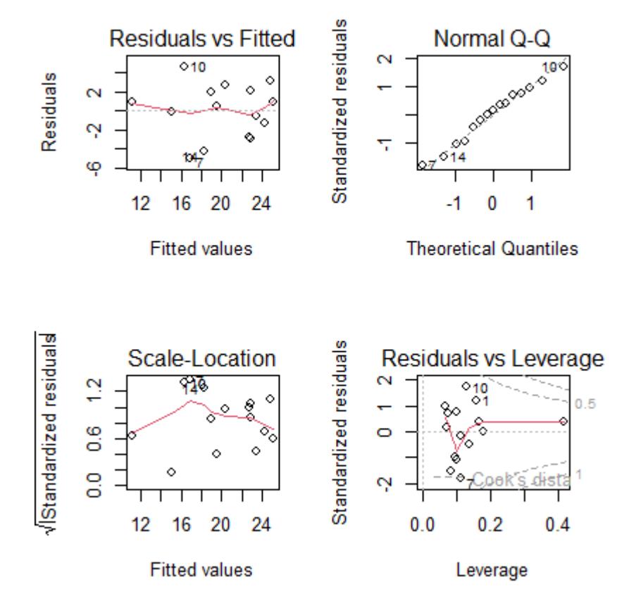 Das Überprüfen der Voraussetzungen (= Modelldiagnostik) erfolgt visuell mittels der sogenannten Residualplots, die man mit dem generische plot-Befehl bekommt, wenn man als Argument das Ergebnis eines linearen Modells hat. Man bekommt dann vier Plots, die man am besten in einem 2 x 2-Arrangement ausgibt (das macht der erste Befehl):