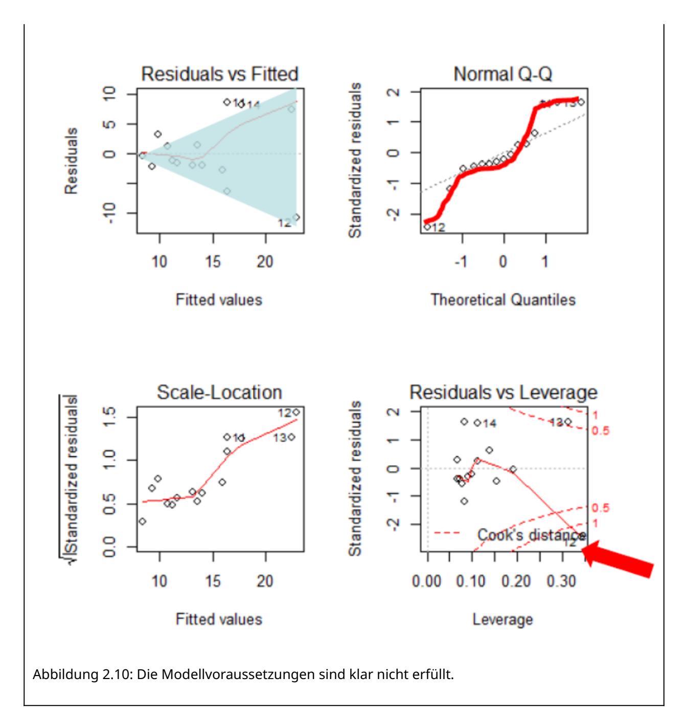 Zum Schluss kommt noch ein Beispiel, bei dem die Modellvoraussetzungen einer linearen Regression klar nicht erfüllt sind (Abbildung 2.10): (a) es liegt starke Varianzinhomogenität vor (links oben als nach rechts offener Keil erkennbar, links unten als klar ansteigende Kurve); (b) die Normalverteilung der Residuen ist auch nicht gegeben (im Q-Q-Plot rechts oben weichen die Punkte stark von der theoretischen Kurve ab und bilden stattdessen eine Treppenkurve). Schliesslich sehen wir rechte unten auch noch, dass es einen extrem einflussreichen Datenpunkt mit Cook’s distance > 1 und einen weiteren mit Cook’s distance > 0.5 gibt.