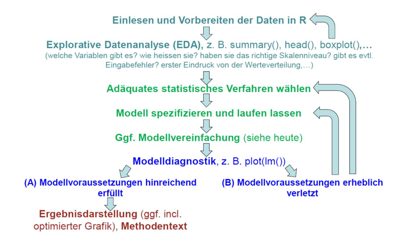 Abschliessend sei der generellen Ablauf einer statistischen Analyse noch einmal schematisch zusammengefasst, wie er für alle schon besprochenen und auch alle noch kommenden Verfahren gilt: