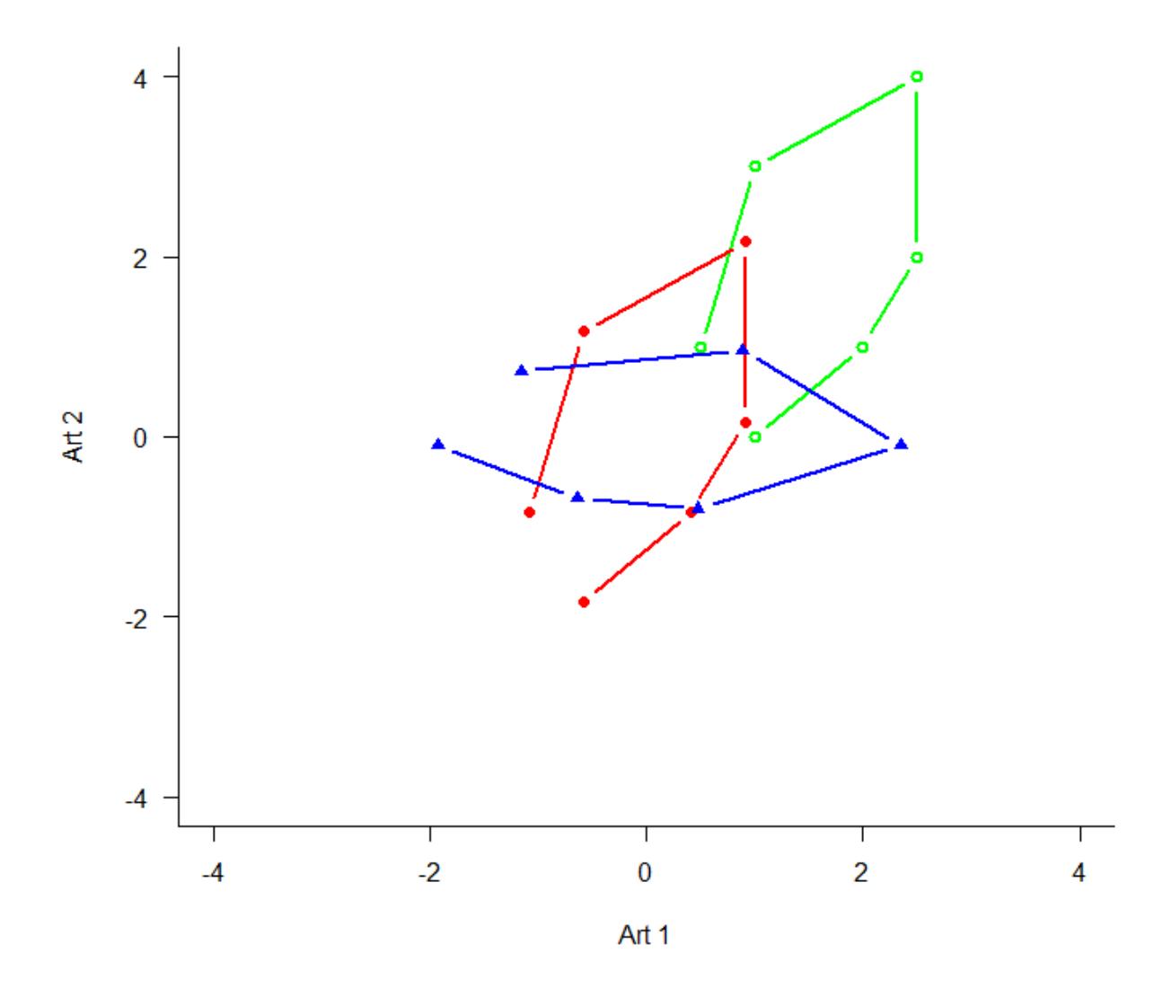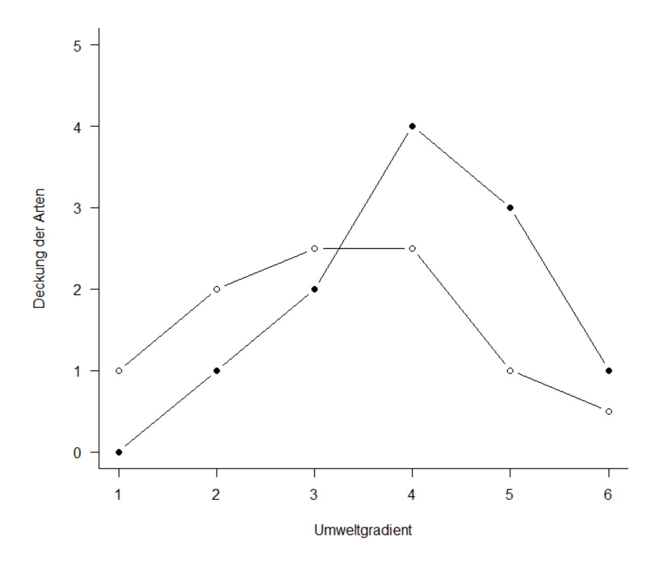Um diese Idee zu visualisieren, nehmen wir ein System von nur zwei Variablen, da wir diese noch auf einer Ebene (d. h. im gedruckten Skript) visualisieren können. Stellen wir uns sechs Beobachtungspunkte entlang eines Umweltgradienten (z. B. Meereshöhe) vor. An jedem dieser Beobachtungspunkte wird die Häufigkeit von zwei Arten (Art 1: gefüllte Kreise, Art 2: offene Kreise) ermittelt, etwa folgendermassen: