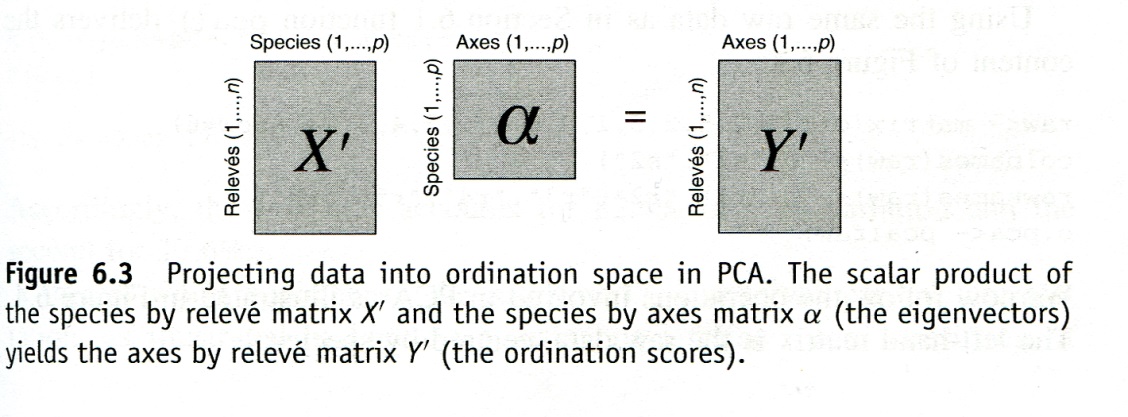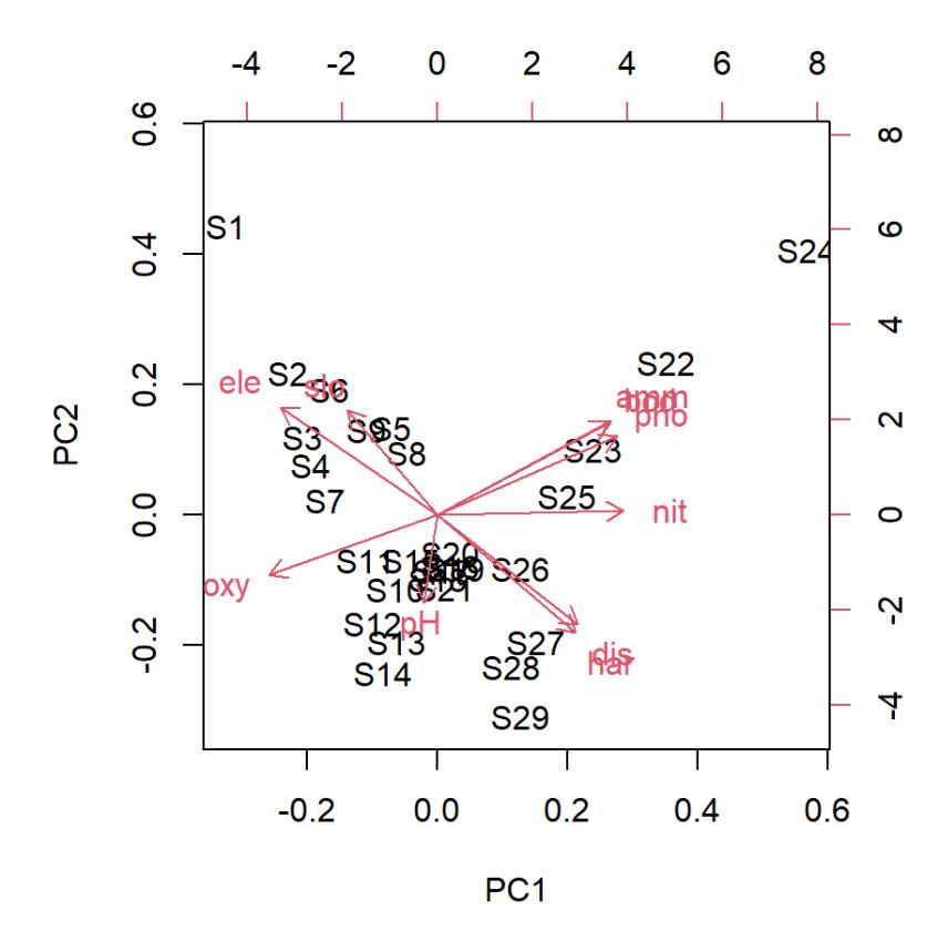[…]Mit $x im PCA-Objekt ist schliesslich codiert, wo im Ordinationsraum unsere 29 Beobachtungspunkte zu liegen kommen. Diese sogenannten Scores sind einfach die Koordinaten im n-dimensionalen Raum der PCA. Zur Interpretation einer Ordination werden diese oft als Punkte in das Ordinationsdiagramm geplottet (s. u.).