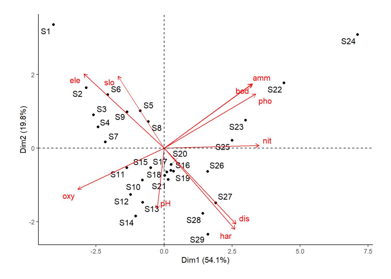 Wir führen die PCA mit dem prcomp-Befehl aus. Da die verschiedenen Umweltvariablen auf unterschiedlichen Skalen gemessen wurden (z.B. mg L-1 oder m3 s-1) sollte man sie sinnvollerweise vor der Durchführung der PCA standardisieren. Das geschieht mit dem Parameter scale = TRUE, der jede der Variablen so transformiert, dass sie einen Mittelwert von 0 und eine Standardabweichung von 1 hat.
