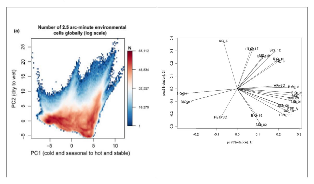 (a) Visualisierung 1: Hier wurden etwa 20 verschiedene bioklimatische Variablen für alle Rasterzellen der Erdoberfläche (Farbkodierung gibt die Häufigkeit wieder) einer PCA unterworfen. Die Klimadaten sind so hoch korreliert, dass die ersten beiden Achen (Hauptkomponenten) PC1 und PC2 zusammen 76 % der Varianz im Gesamtdatensatz kodieren. Es wäre also unsinnig, die 20 Variablen einzeln zu analysieren. Durch die rechts gezeigten Korrelationen der Originalvariablen mit