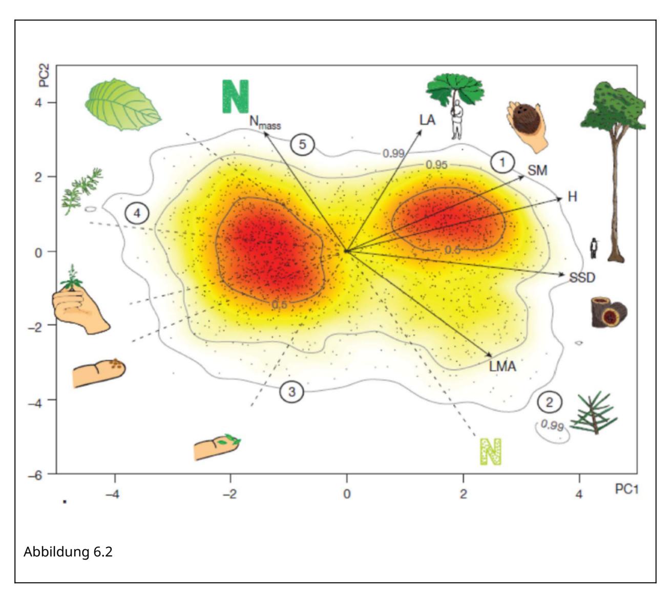 (b) Visualisierung 2: Hier wurden 6 funktionelle Merkmale (traits) von Pflanzenarten weltweit einer PCA unterworfen. Diese erweisen sich so weit korreliert, dass die ersten beiden Achen (Hauptkomponenten) PC1 und PC2 zusammen 74% der Varianz enthalten. Der eine wesentliche Gradient ist der von winizigen, kleinsamigen Arten zu grossen Arten mit schweren Samen (in der Abbildunge mit 1 resp. SM bezeichnet). Dazu weitgehend orthogonal ist der Gradient von Pflanzen mit stickstoffreichen Blättern (links oben) zu Pflanzen mit stickstoffarmen Blättern (rechts unten).