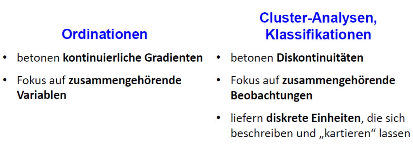 Innerhalb der multivariat-deskriptiven Statistik stellen Ordinationen und Cluster-Analysen (Klassifikationen) zwei komplementäre Ansätze dar. Sie betonen unterschiedliche Aspekte des Datensatzes und können oftmals sogar sinnvoll parallel verwendet werden. Die wesentlichen Unterschiede zeigt die folgende Tabelle: