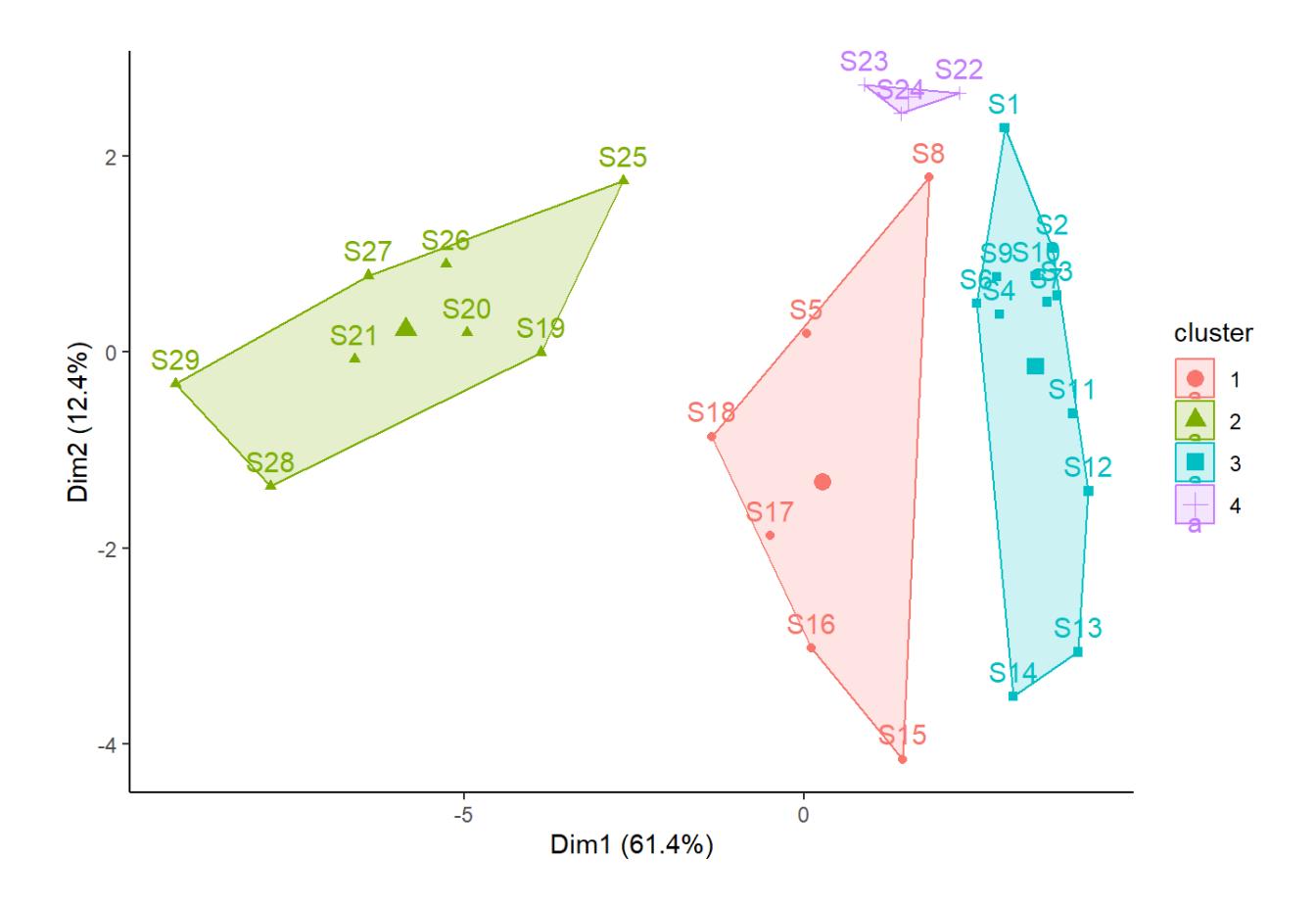 # k-means-Clustering mit 4 Gruppen durchführenset.seed(123)kmeans_1 <- kmeans(spe_norm, centers = 4, nstart = 100)kmeans_1$cluster