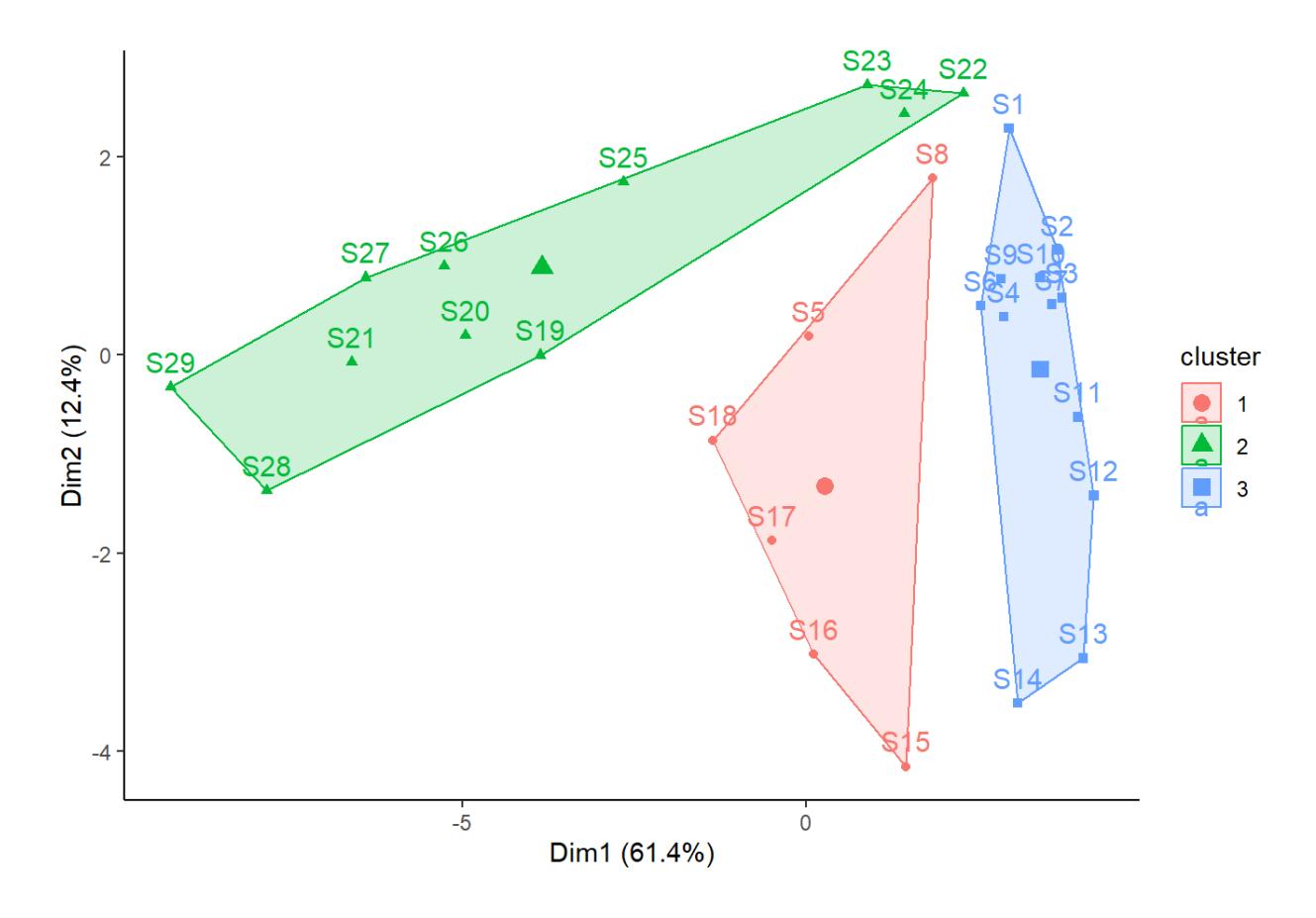 Die farbige Visualisierung links zeigt, dass es eben keine hierarchische Clusteranalyse ist. Bei k > 2 bleibt die ursprüngliche Abgrenzung der zwei Hauptcluster nicht erhalten. Gemäss SSI wäre in diesem Fall die 3-Cluster-Lösung die beste (es sei aber empfohlen, solchen numerischen “Empfehlungen” nicht blindlings zu glauben). Im Ordinationsraum der Umweltvariablen, sieht die 3- Cluster-Lösung der Fischdaten wie folgt aus: