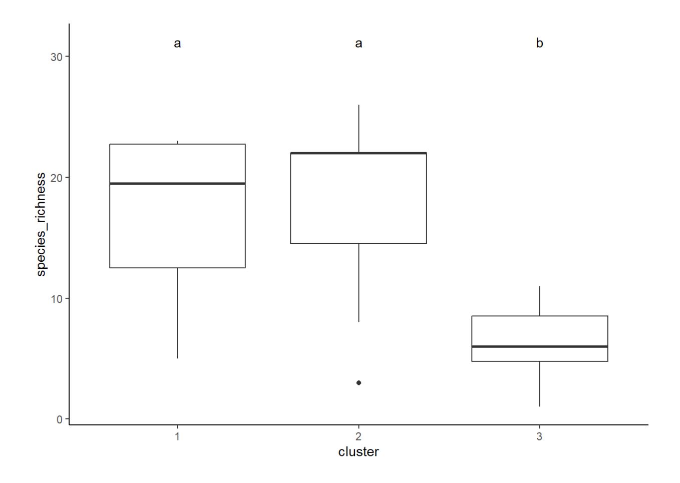 Sobald wir uns auf eine Cluster-Auflösung festgelegt haben, gilt es auch noch, die Cluster zu charakterisieren und zu vergleichen. Das kann z.B. mit einer ANOVA geschehen (hier für die 3- Cluster-Lösung und die Fischartenzahl pro Beobachtungsstelle als abhängiger Variable). Den Code dafür und weitere Beispiele gibt es im R Demo Code.